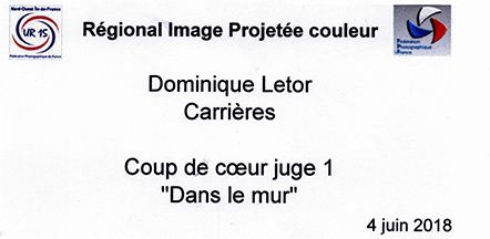 Coup de Coeur du juge N° 1 pour la photographie ''Dans le Mur'' au concours régional Image Projetée Couleur avec le photo club le MIC ( Le Monde de l'Image de Carrières sur Seine)